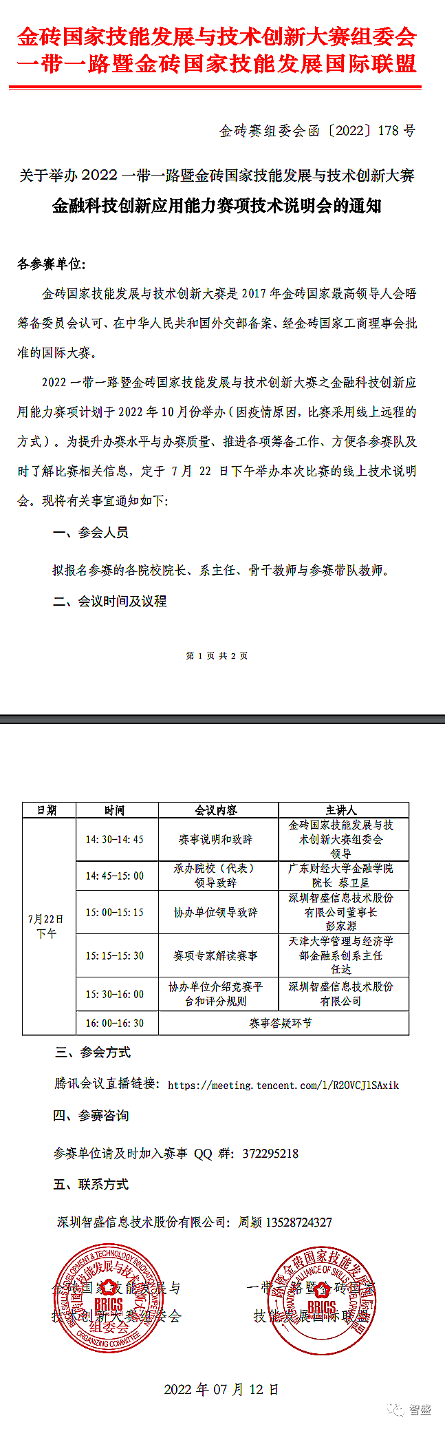2022一帶一路暨金磚國(guó)家技能發(fā)展與技術(shù)創(chuàng)新大賽之金融科技創(chuàng)新應(yīng)用能力賽項(xiàng)計(jì)劃于2022年10月份舉辦(因疫情原因,比賽采用線(xiàn)上遠(yuǎn)程的方式)。為提升辦賽水平與辦賽質(zhì)量、推進(jìn)各項(xiàng)籌備工作、方便各參賽隊(duì)及時(shí)了解比賽相關(guān)信息,定于 7月 22 日下午舉辦本次比賽的線(xiàn)上技術(shù)說(shuō)明會(huì)。