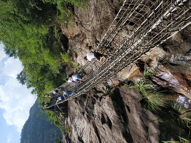 下午來到了英德——天門溝九州驛站;由驛站區(qū)和天門溝九站一廊高山森林峽谷景區(qū)兩大產(chǎn)品組成游覽。我們大隊(duì)人馬一邊爬山一邊領(lǐng)略沿途的風(fēng)景,上山路上都可見到沿山而下的水流,大概天門溝的名稱由來于此。水流在石頭凹陷處形成小水潭,清澈見底,而且十分清涼。