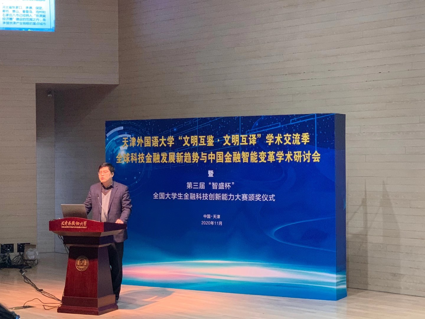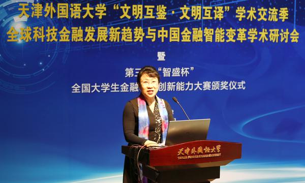 2020年11月8日,第三屆“智盛杯”全國大學生金融科技創(chuàng)新能力大賽頒獎儀式暨天津外國語大學“文明互鑒·文明互譯”學術交流季——“全球科技金融發(fā)展新趨勢與中國金融智能變革學術研討會”在天津外國語大學馬場道校區(qū)隆重舉行。此次頒獎儀式采取線上線下融合方式舉辦,未能到達現場的參會人員通過騰訊會議直播參加。
