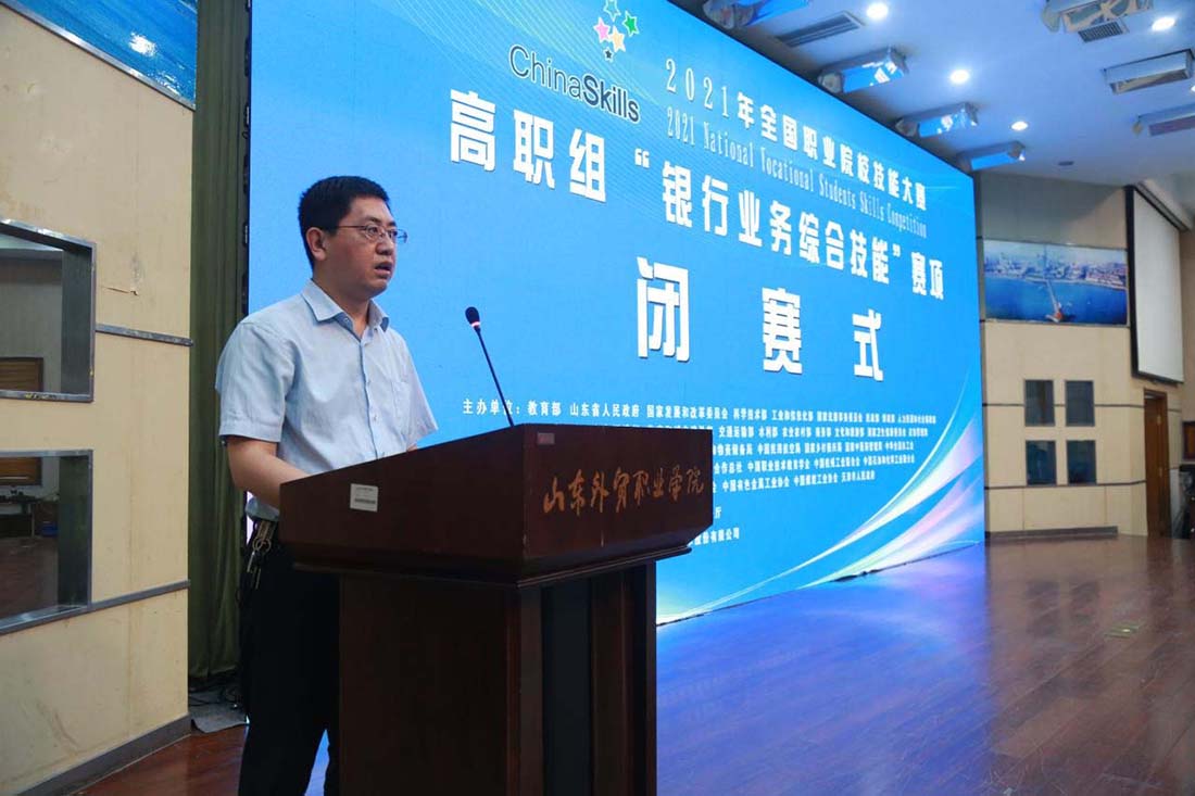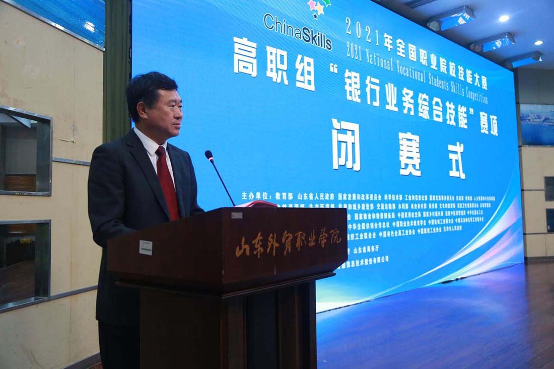 閉幕式上,大賽專家組長(zhǎng)、江蘇省徐州財(cái)經(jīng)高等職業(yè)技術(shù)學(xué)校副校長(zhǎng)張勇對(duì)本次比賽的四個(gè)項(xiàng)目進(jìn)行了點(diǎn)評(píng)。青島市教育工委委員、教育局黨組成員、總督學(xué)李岷,山東省教育廳職業(yè)教育處副處長(zhǎng)李海濤,青島市地方金融監(jiān)督管理局一級(jí)調(diào)研員鞠京福,省商務(wù)廳業(yè)務(wù)聯(lián)絡(luò)辦公室主任姜寶臣,青島農(nóng)商銀行行長(zhǎng)劉宗波,全國(guó)金融職業(yè)教育教學(xué)指導(dǎo)委員會(huì)副秘書(shū)長(zhǎng)成銓,泉州輕工職業(yè)學(xué)院商學(xué)院院長(zhǎng)顏建立等出席了閉幕式,山東外貿(mào)職業(yè)學(xué)院院長(zhǎng)刁建東主持閉幕儀式。