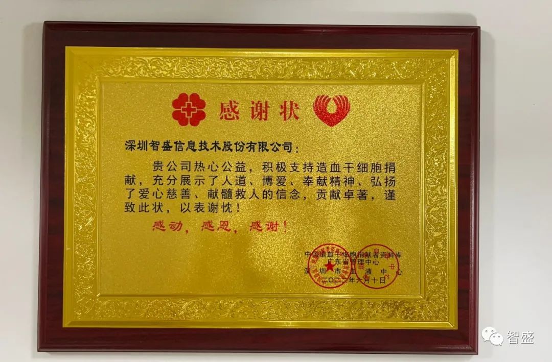 當日,深圳市血液中心為韋宗杰和深圳智盛信息技術(shù)股份有限公司頒發(fā)了榮譽證書和感謝狀。