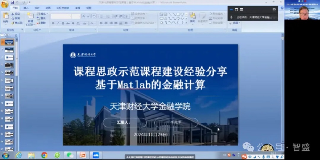 天津財經(jīng)大學(xué)金融學(xué)院李兆軍教授就基于 Matlab 的金融計算課程思政示范課程建設(shè)作經(jīng)驗分享。他先介紹課程由《金融計算與量化分析》教改而來,經(jīng)歷疫情上網(wǎng)課等,已獲校、市相關(guān)成果。接著從課程基本情況、目標(biāo)完成、教學(xué)手段、思政結(jié)合、改革創(chuàng)新點五方面展開匯報,提及依據(jù)教育部文件開展建設(shè),闡述課程各模塊內(nèi)容、考核方式,強調(diào)教學(xué)手段多樣,如講知識、小組討論、案例教學(xué)等,還談及網(wǎng)絡(luò)資源利用及思政融入需注意事項,包括突出職業(yè)、愛國、擔(dān)當(dāng)、工匠精神等,最后總結(jié)課程的基本指標(biāo)、創(chuàng)新點及建設(shè)過程是不斷完善的。